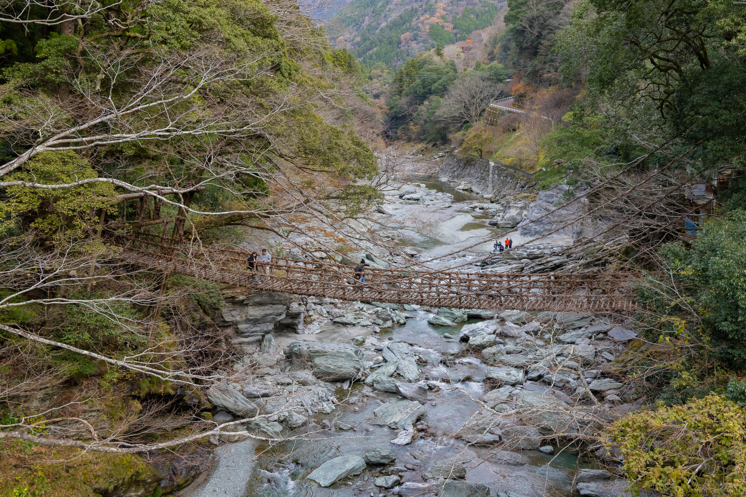 Cross Kazurabashi Bridge, an ancient ivy bridge nestled in the forest. In addition to its natural beauty, this site holds historical significance for the Japanese people, having been used as an escape route by the Heike clan to escape their Genji enemies.